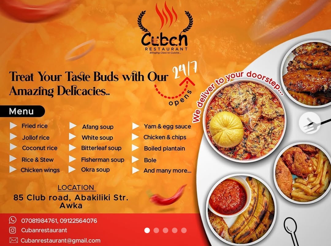 Cuban Restaurant meals in your order will be delivered (within Awka only, when customers have completed payment for meals ordered)